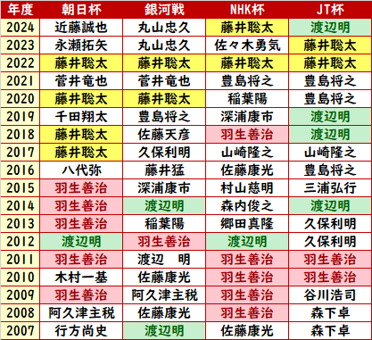 八大タイトル戦の次に格付けされる四大一般棋戦(朝日杯将棋オープン戦、銀河戦、NHK杯将棋トーナメント、将棋日本シリーズJTプロ公式戦)の歴代優勝者はこのようになっています。