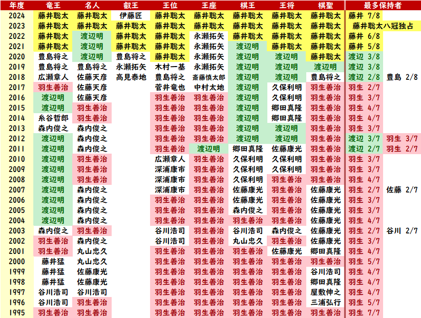 2025年度竜王戦終了時点でのタイトル保持者はこうなっています。